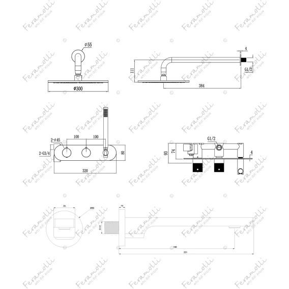 Душевой комплект Feramolli Dante ORSD3S 300 мм, с термостатом, медь матовая