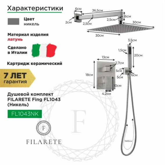 Душевой комплект Filarete Fing FL1043NK 300 мм, со смесителем, никель