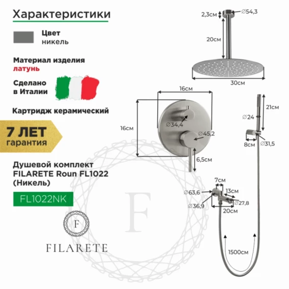 Душевой комплект Filarete Roun FL1022NK 300 мм, со смесителем, никель