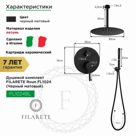 Душевой комплект Filarete Roun FL1024BL 300 мм, со смесителем, черный матовый