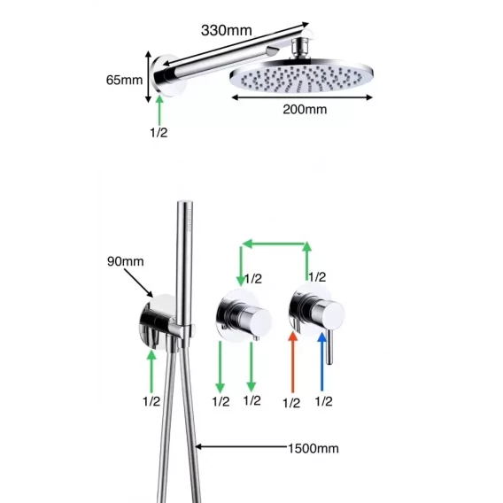 Душевой шланг, Душевая лейка, Подключение для душевого шланга с держателем, Верхний душ, Скрытая монтажная часть, Смеситель, Кронштейн