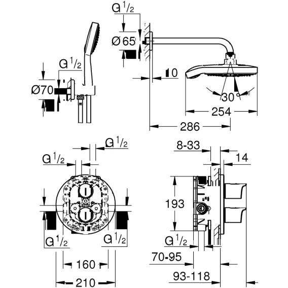 Душевой шланг, Душевая лейка, Подключение для душевого шланга с держателем, Верхний душ, Скрытая монтажная часть, Кронштейн, Термостат