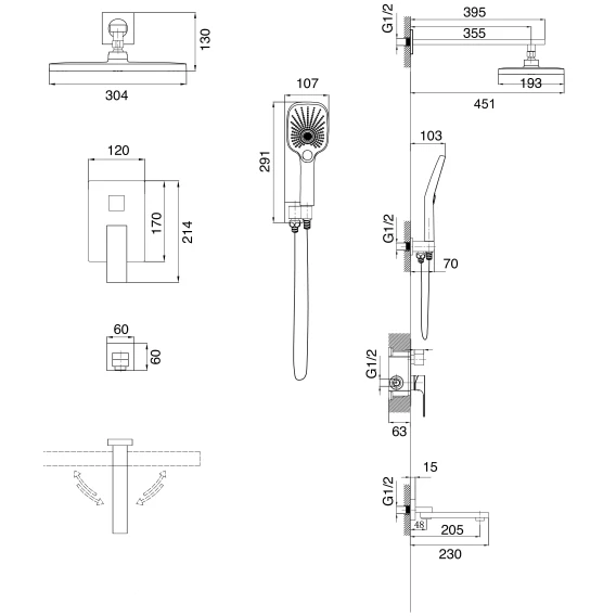 Аэратор, Душевой шланг, Душевая лейка, Подключение для душевого шланга с держателем, Верхний душ, Излив, Скрытая монтажная часть, Смеситель, Кронштейн