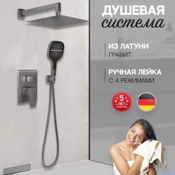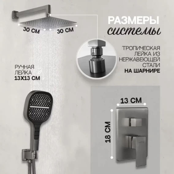 Душевой комплект Hansberge H6070BG 300 мм, со смесителем, графит