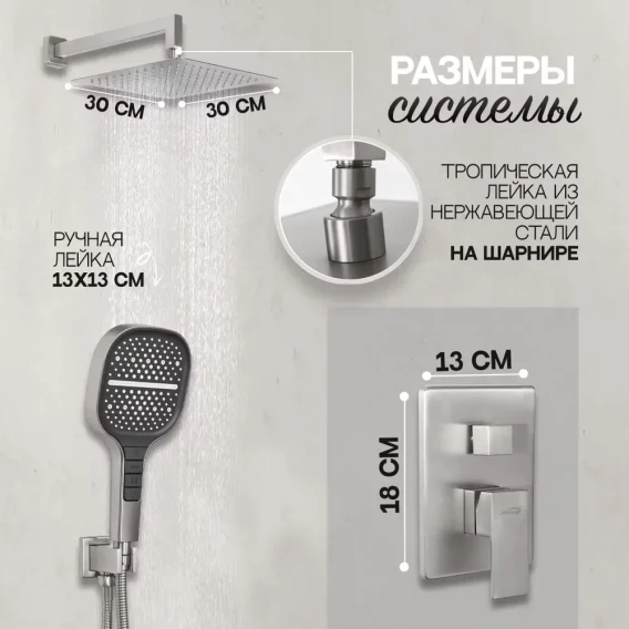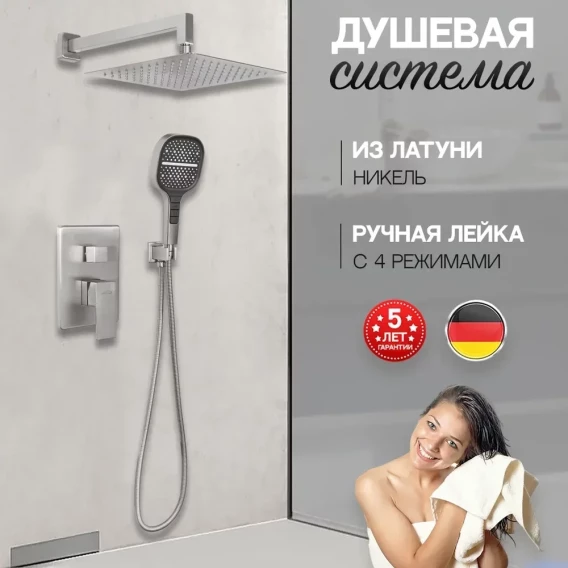 Душевой комплект Hansberge H6070NK 300 мм, со смесителем, никель