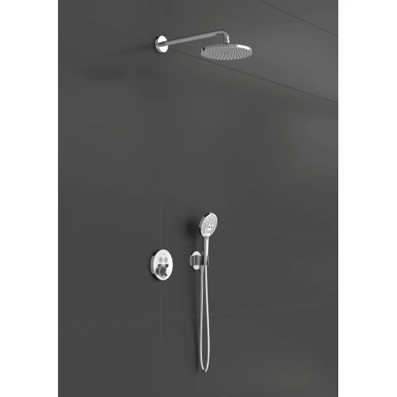 • состоит из: верхний душ, ручной душ, термостат для душа, скрытая часть, розетка, душевой шланг