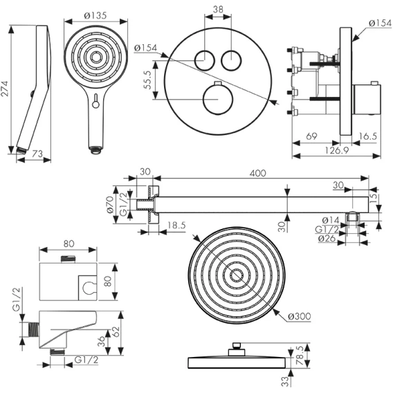 Душевой шланг, Душевая лейка, Подключение для душевого шланга с держателем, Верхний душ, Скрытая монтажная часть, Кронштейн, Термостат