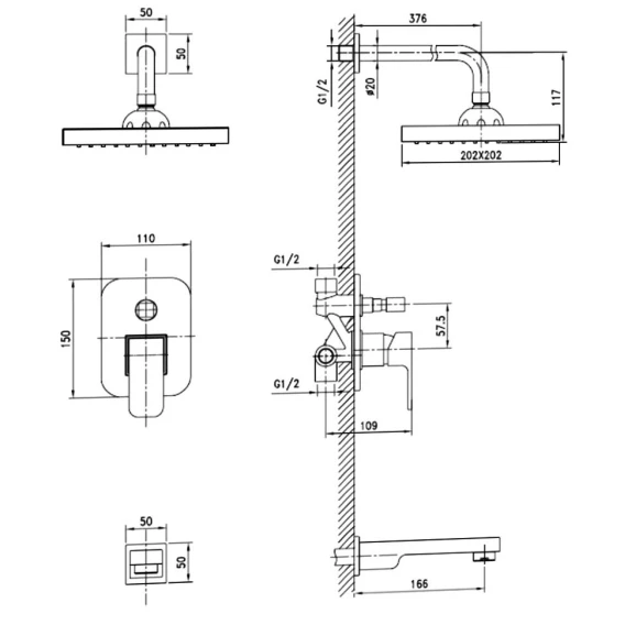 Верхний душ, Излив, Скрытая монтажная часть, Смеситель, Кронштейн
