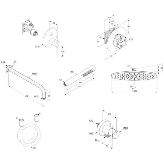 Душевой шланг, Душевая лейка, Подключение для душевого шланга с держателем, Верхний душ, Скрытая монтажная часть, Смеситель, Кронштейн