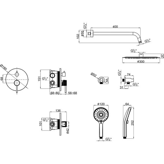 Душевой шланг, Душевая лейка, Подключение для душевого шланга с держателем, Верхний душ, Скрытая монтажная часть, Смеситель, Кронштейн