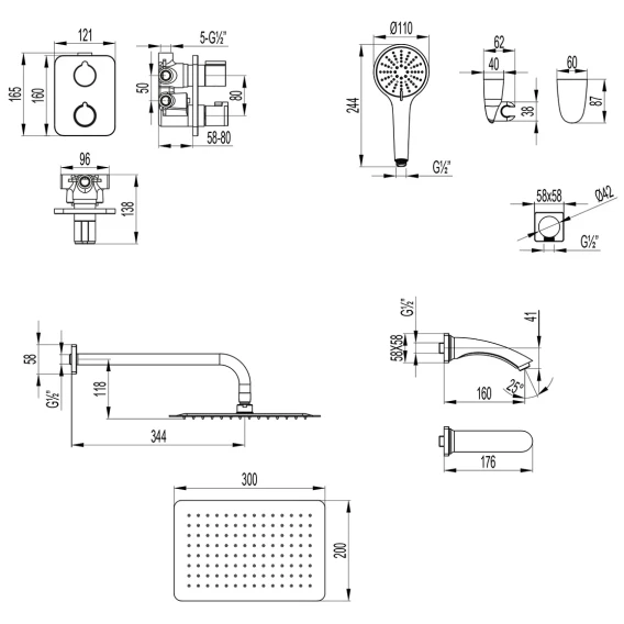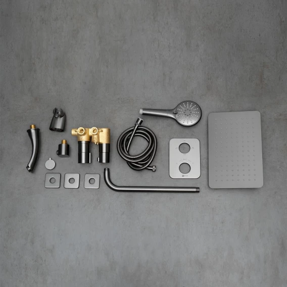 Аэратор, Душевой шланг, Душевая лейка, Держатель для душевой лейки, Подключение для душевого шланга, Верхний душ, Излив, Скрытая монтажная часть, Кронштейн, Термостат