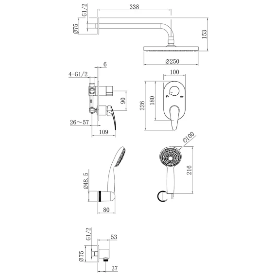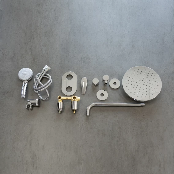 Душевой шланг, Душевая лейка, Держатель для душевой лейки, Подключение для душевого шланга, Верхний душ, Скрытая монтажная часть, Смеситель, Кронштейн