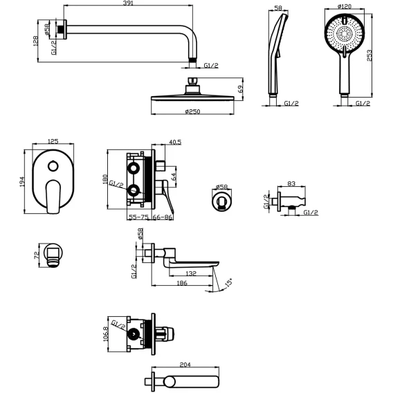 Аэратор, Душевой шланг, Душевая лейка, Подключение для душевого шланга с держателем, Верхний душ, Излив, Скрытая монтажная часть, Смеситель, Кронштейн