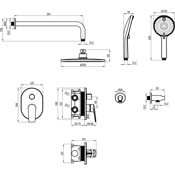 Душевой шланг, Душевая лейка, Подключение для душевого шланга с держателем, Верхний душ, Скрытая монтажная часть, Смеситель, Кронштейн