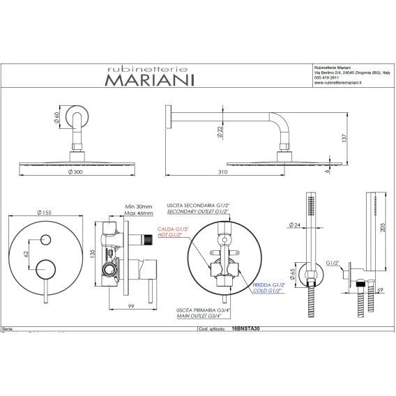 Душевой комплект Mariani NEXT B1417HNXP3TB30 300 мм, со смесителем, черный матовый