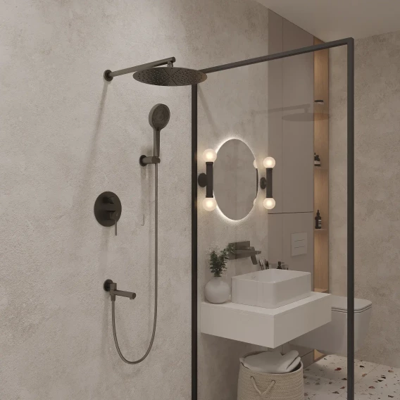 Аэратор, Душевой шланг, Душевая лейка, Держатель для душевой лейки, Подключение для душевого шланга, Верхний душ, Излив, Скрытая монтажная часть, Смеситель, Кронштейн