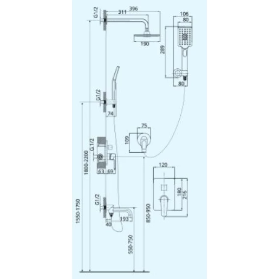 Аэратор, Душевой шланг, Душевая лейка, Подключение для душевого шланга с держателем, Верхний душ, Скрытая монтажная часть, Смеситель, Кронштейн