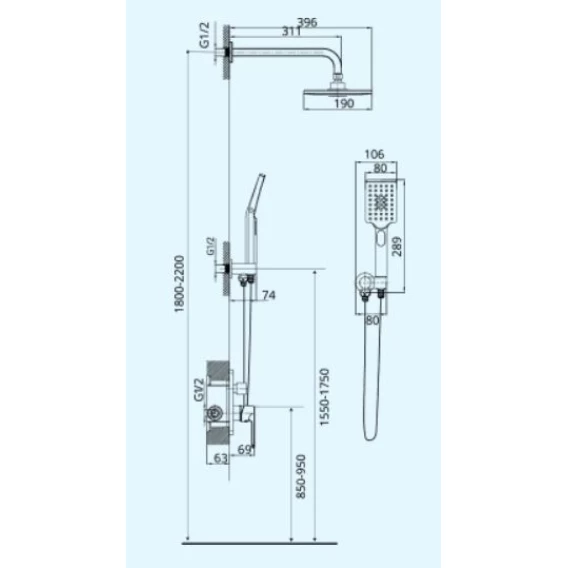 Душевой шланг, Душевая лейка, Подключение для душевого шланга с держателем, Верхний душ, Скрытая монтажная часть, Смеситель, Кронштейн