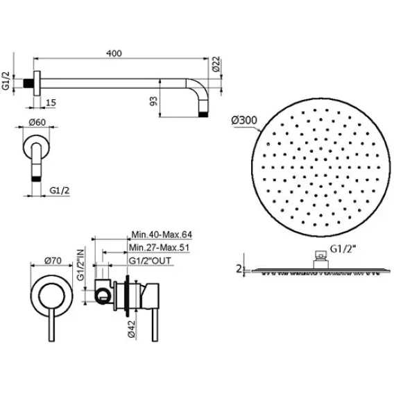 Верхний душ, Скрытая монтажная часть, Смеситель, Кронштейн