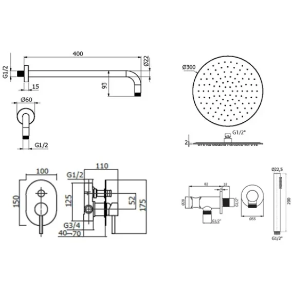 Душевой шланг, Душевая лейка, Подключение для душевого шланга с держателем, Верхний душ, Скрытая монтажная часть, Смеситель, Кронштейн