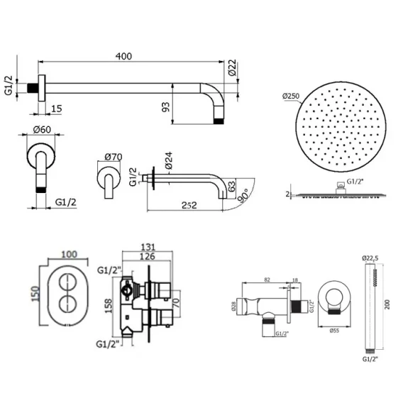 Аэратор, Душевой шланг, Душевая лейка, Подключение для душевого шланга с держателем, Верхний душ, Излив, Скрытая монтажная часть, Кронштейн, Термостат