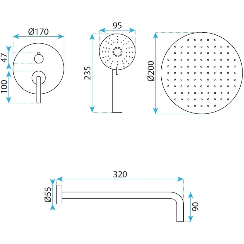 Душевой шланг, Душевая лейка, Подключение для душевого шланга с держателем, Верхний душ, Скрытая монтажная часть, Смеситель, Кронштейн