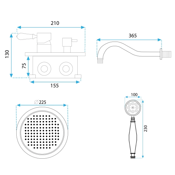Душевой шланг, Душевая лейка, Подключение для душевого шланга с держателем, Верхний душ, Скрытая монтажная часть, Смеситель, Кронштейн