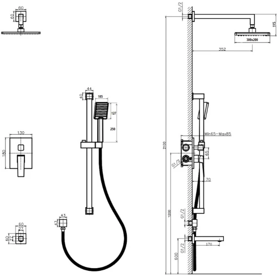 Аэратор, Душевой шланг, Душевая лейка, Держатель для душевой лейки, Подключение для душевого шланга, Верхний душ, Излив, Скрытая монтажная часть, Смеситель, Кронштейн, Штанга душевая