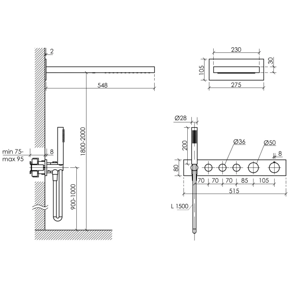 Душевой шланг, Душевая лейка, Подключение для душевого шланга с держателем, Верхний душ, Скрытая монтажная часть, Кронштейн, Термостат
