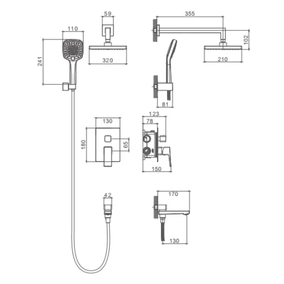 Аэратор, Душевой шланг, Душевая лейка, Держатель для душевой лейки, Верхний душ, Скрытая монтажная часть, Смеситель, Кронштейн