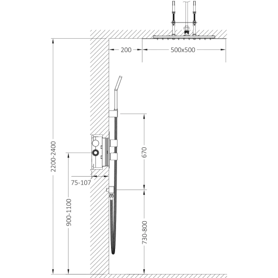 Душевой шланг, Душевая лейка, Держатель для душевой лейки, Подключение для душевого шланга, Верхний душ, Скрытая монтажная часть, Термостат