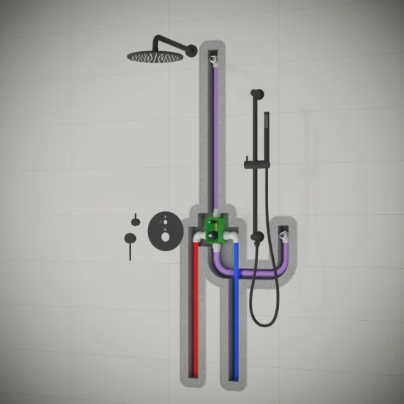 Душевой шланг, Душевая лейка, Держатель для душевой лейки, Подключение для душевого шланга, Верхний душ, Скрытая монтажная часть, Смеситель, Кронштейн, Штанга душевая