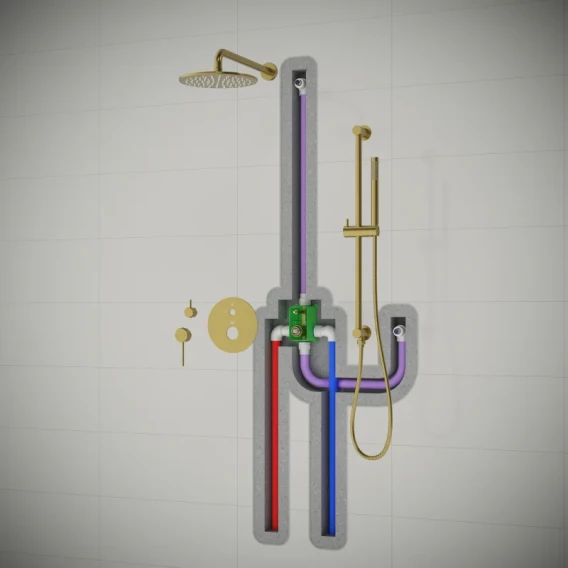 Душевой шланг, Душевая лейка, Держатель для душевой лейки, Подключение для душевого шланга, Верхний душ, Скрытая монтажная часть, Смеситель, Кронштейн, Штанга душевая