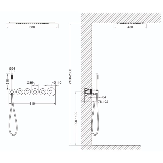Душевой шланг, Душевая лейка, Подключение для душевого шланга с держателем, Подсветка, Верхний душ, Скрытая монтажная часть, Термостат