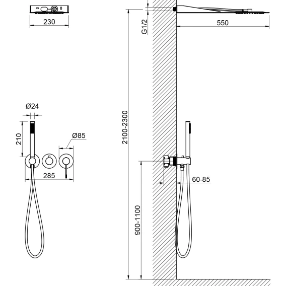 Душевой шланг, Душевая лейка, Подключение для душевого шланга с держателем, Верхний душ, Скрытая монтажная часть, Смеситель, Кронштейн, Штанга душевая