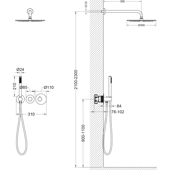 Душевой шланг, Душевая лейка, Подключение для душевого шланга с держателем, Верхний душ, Скрытая монтажная часть, Кронштейн, Штанга душевая, Термостат