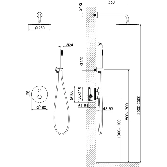 Душевой шланг, Душевая лейка, Подключение для душевого шланга с держателем, Верхний душ, Скрытая монтажная часть, Смеситель, Кронштейн