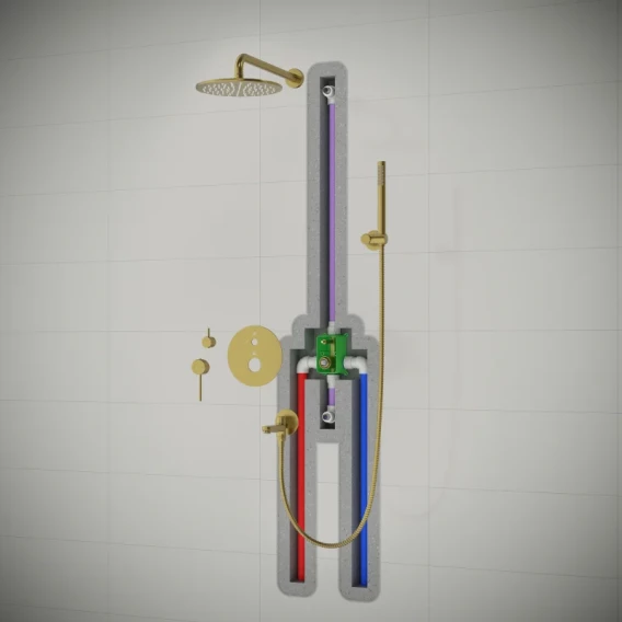 Душевой шланг, Душевая лейка, Держатель для душевой лейки, Подключение для душевого шланга, Верхний душ, Излив, Скрытая монтажная часть, Смеситель, Кронштейн