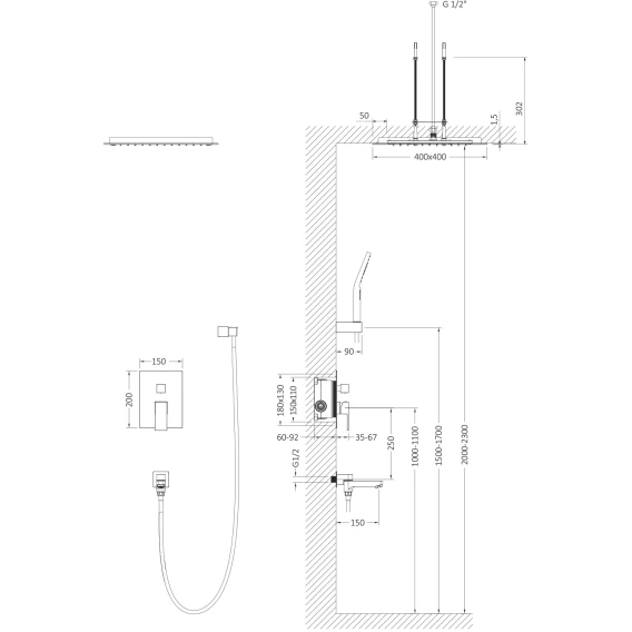 Аэратор, Душевой шланг, Душевая лейка, Держатель для душевой лейки, Подключение для душевого шланга, Верхний душ, Излив, Скрытая монтажная часть, Смеситель