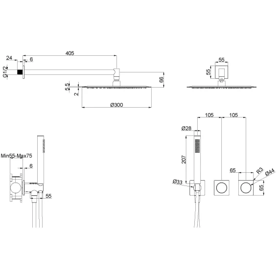 Душевой шланг, Душевая лейка, Подключение для душевого шланга с держателем, Верхний душ, Скрытая монтажная часть, Смеситель, Кронштейн