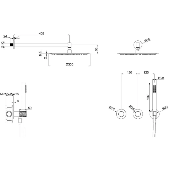 Душевой шланг, Душевая лейка, Подключение для душевого шланга с держателем, Верхний душ, Скрытая монтажная часть, Смеситель, Кронштейн