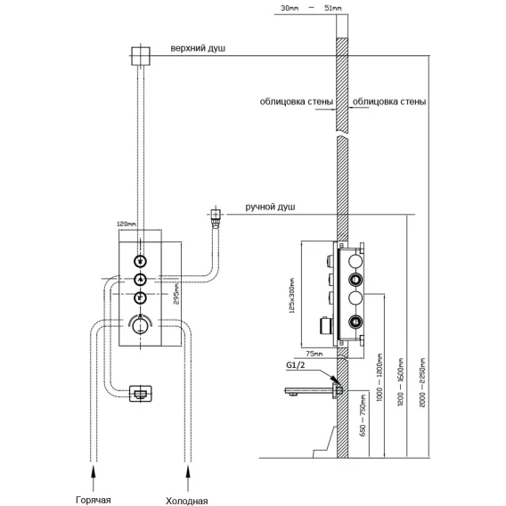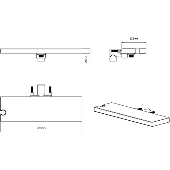 Аэратор, Душевой шланг, Душевая лейка, Подключение для душевого шланга с держателем, Полочка, Верхний душ, Излив, Скрытая монтажная часть, Смеситель, Кронштейн