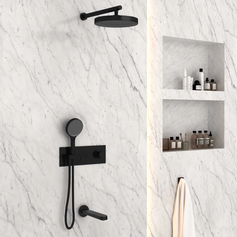 Аэратор, Душевой шланг, Душевая лейка, Подключение для душевого шланга с держателем, Верхний душ, Излив, Скрытая монтажная часть, Кронштейн, Термостат