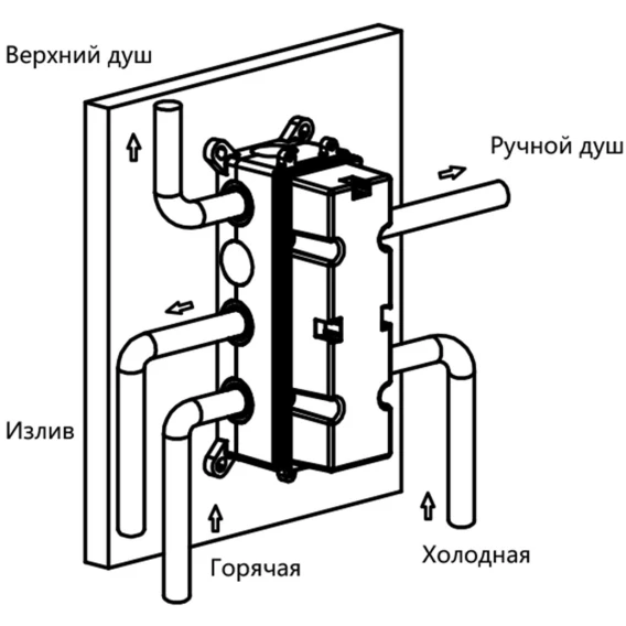 Аэратор, Душевой шланг, Душевая лейка, Подключение для душевого шланга с держателем, Полочка, Верхний душ, Излив, Скрытая монтажная часть, Кронштейн, Термостат