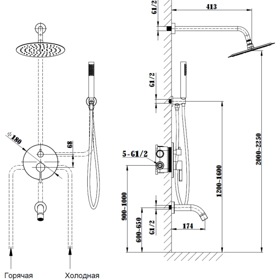 Аэратор, Душевой шланг, Душевая лейка, Подключение для душевого шланга с держателем, Верхний душ, Излив, Скрытая монтажная часть, Смеситель, Кронштейн