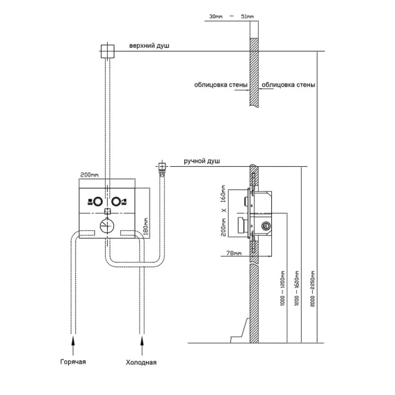 Душевой шланг, Душевая лейка, Подключение для душевого шланга с держателем, Верхний душ, Скрытая монтажная часть, Смеситель, Кронштейн