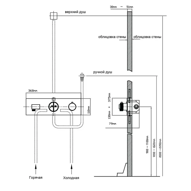 Душевой шланг, Душевая лейка, Подключение для душевого шланга с держателем, Верхний душ, Скрытая монтажная часть, Кронштейн, Термостат