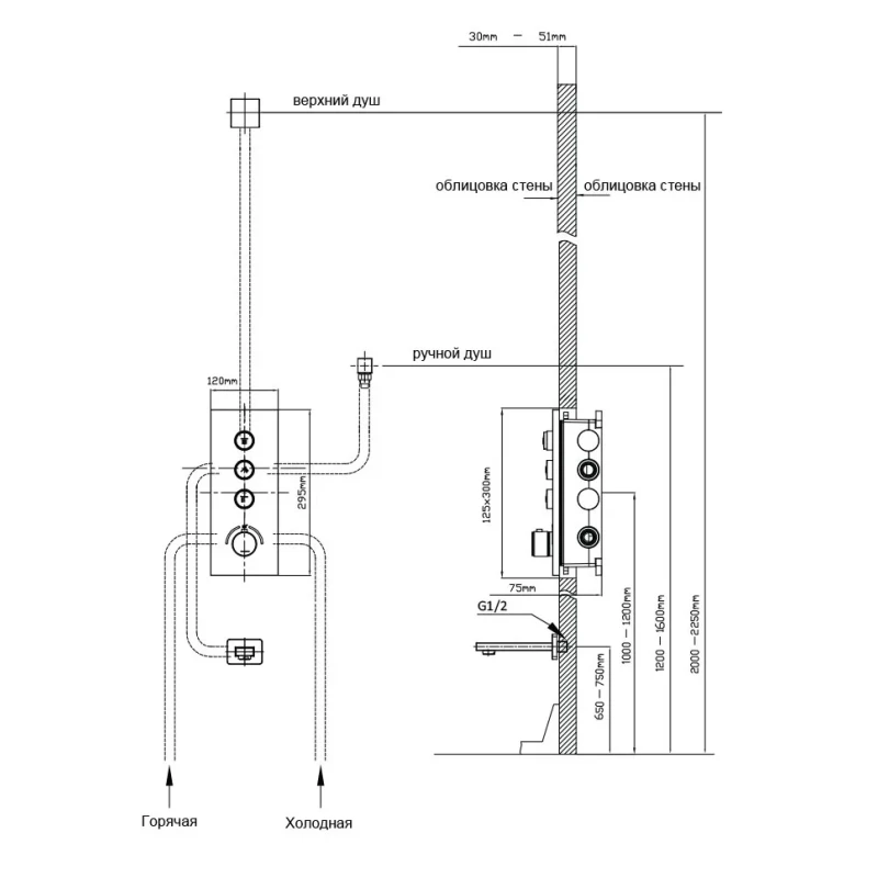 Аэратор, Душевой шланг, Душевая лейка, Подключение для душевого шланга с держателем, Полочка, Верхний душ, Излив, Скрытая монтажная часть, Кронштейн, Термостат