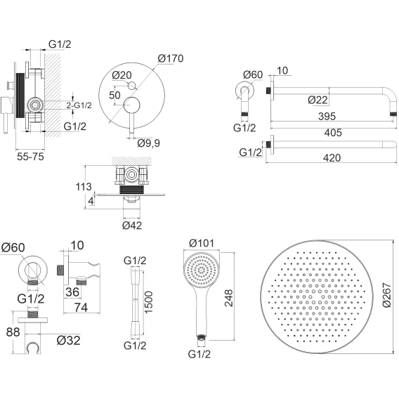 Душевой шланг, Душевая лейка, Подключение для душевого шланга с держателем, Верхний душ, Скрытая монтажная часть, Смеситель, Кронштейн