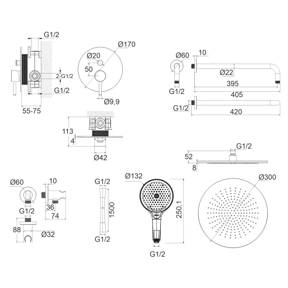 Душевой шланг, Душевая лейка, Подключение для душевого шланга с держателем, Верхний душ, Скрытая монтажная часть, Смеситель, Кронштейн